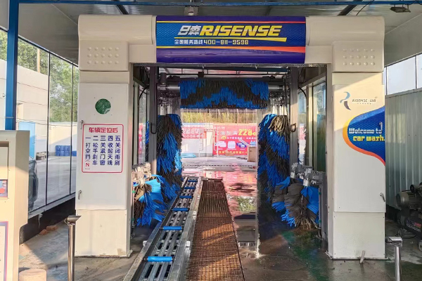 辽宁加油站安装日森隧道式自动洗车机,每小时可清洗45-55辆车的全自动洗车设备,加油站车流量大也不怕。
