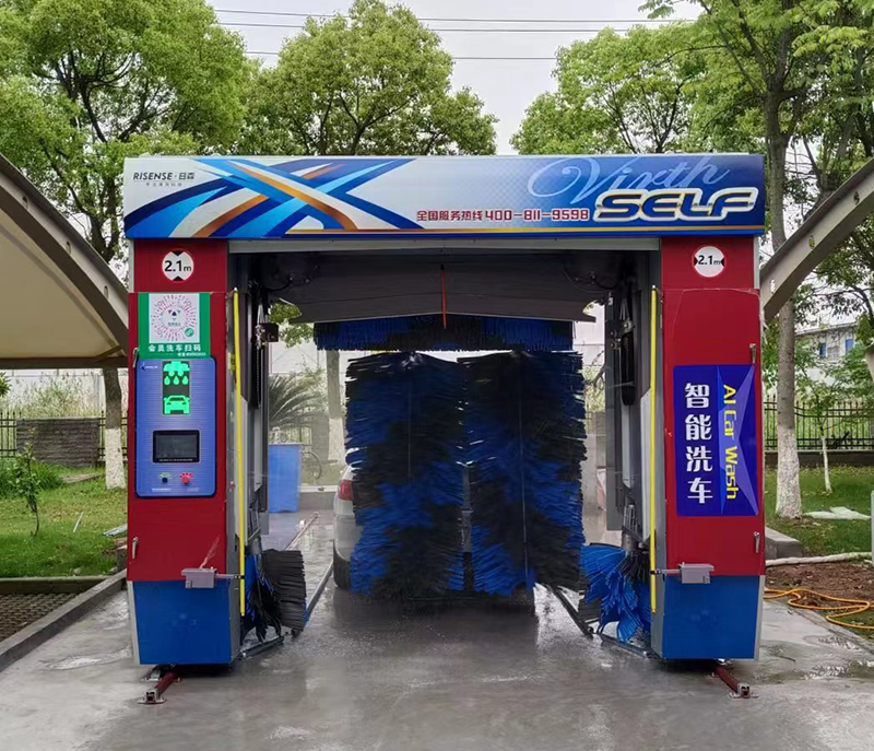 五刷往复式洗车机、泡沫洗、水蜡洗、4风机风干。可搭配智能自助系统,实现无人值守智能洗车。